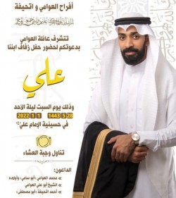 رُزق الشاب محمد قاسم آل حبيب بمولود اتفق وحرمه على تسميته «عبد العزيز». أسرة ”جهينة الإخبارية“ تبارك له على المولود جعله الله من مواليد السعادة واقر الله به عين والديه. ‏ ...