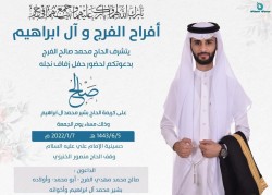 تحتفل عائلة الفرج وآل ابراهيم في العوامية مساء يوم الجمعة بزفاف الشاب صالح محمد صالح مهدي الفرج على كريمة الحاج بشير محمد آل ابراهيم في حسينية الإمام علي وقف الحاج منصور الخنيزي وسط فرحة الأهل والأصدقاء ومحبي العريسين. وعبر العريس عن سعادته الغامرة بدخوله القفص الذهبي، سائلا الله أن يوفقه وعروسه ويرزقهما الذرية الصالحة. أسرة ”جهينة الإخبارية“ تهنئ العريسين وعائلتيهما وتسأل الله ان يبارك لهما، متمنين لهما حياة سعيدة ‏ ...