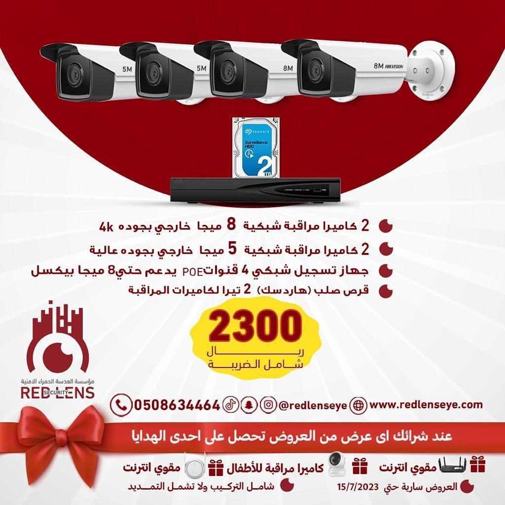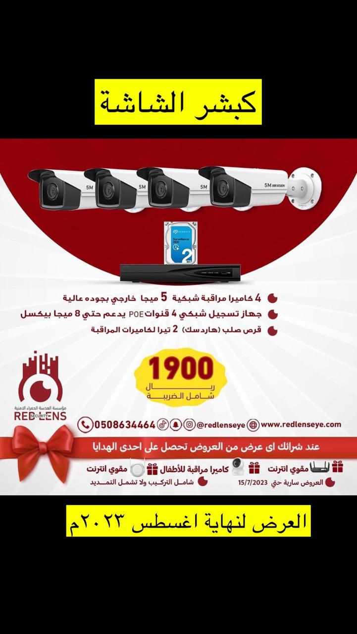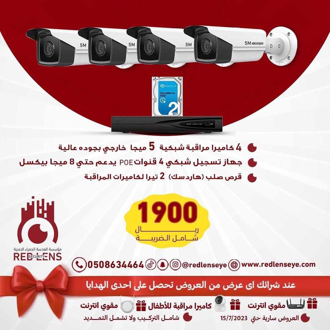 4 كاميرات شبكية 5 ميجابكسل + جهاز تسجيل + ذاكرة 2 تيرا = 1900 ريال مع التركيب