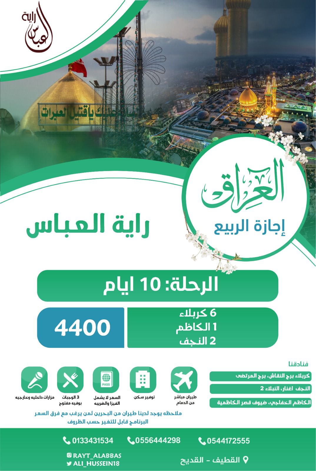 تعلن حملة «راية العباس» عن رحلة ”إجازة الربيع“ لزيارة الإمام الحسين والأئمة الأطهار عليهم السّلام.