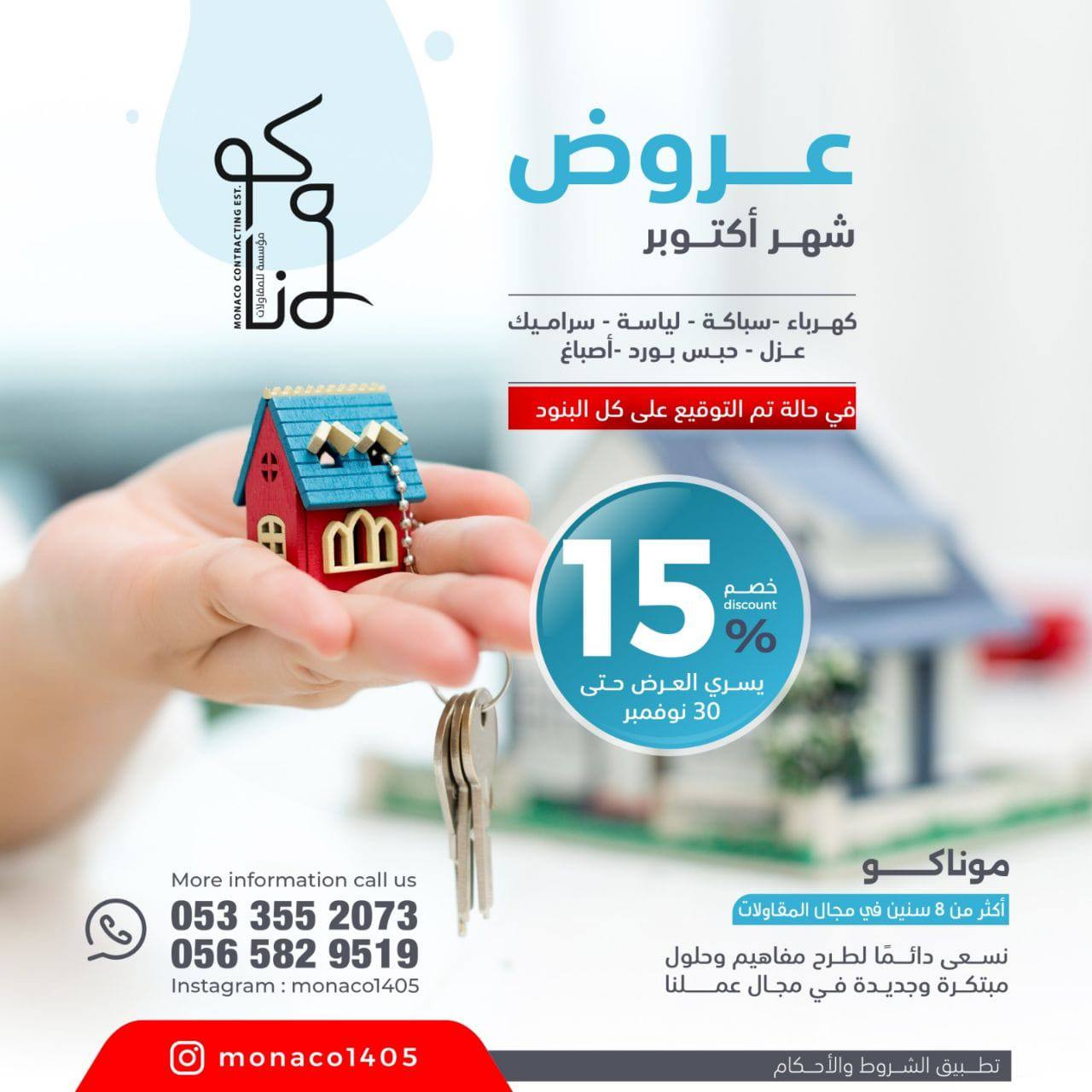خصم 15% على أعمال اللياسة والسيراميك والعزل في «موناكو»