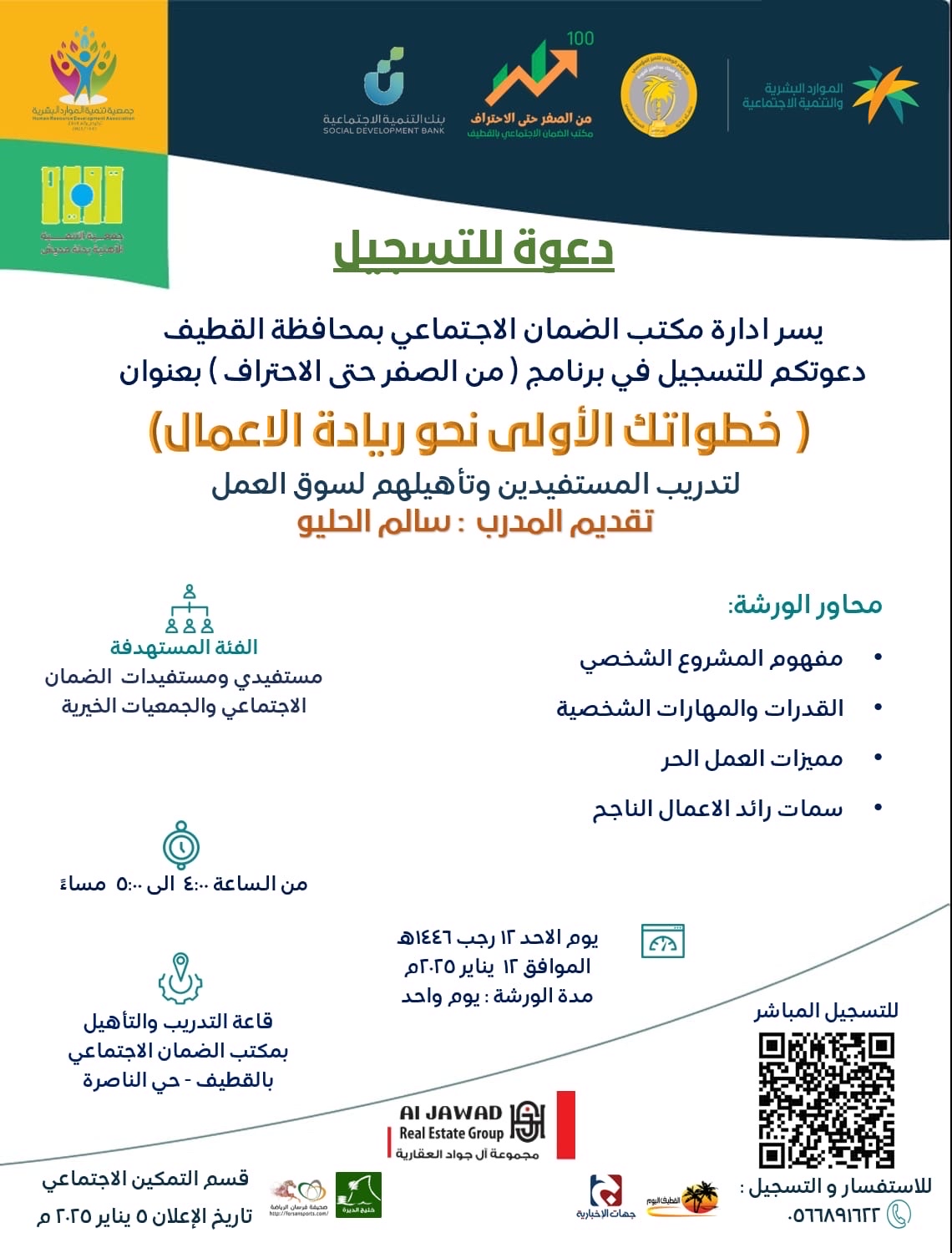 تحت عنوان ”السيرة الذاتية والمقابلات الوظيفية“، ينظم مكتب الضمان الاجتماعي بمحافظة القطيف، ورشة عمل بالتعاون مع جمعية تنمية الموارد البشرية بسيهات، وجمعية التنمية الأهلية بحلة محيش، وذلك ضمن برنامج ”من الصفر إلى الاحتراف“.