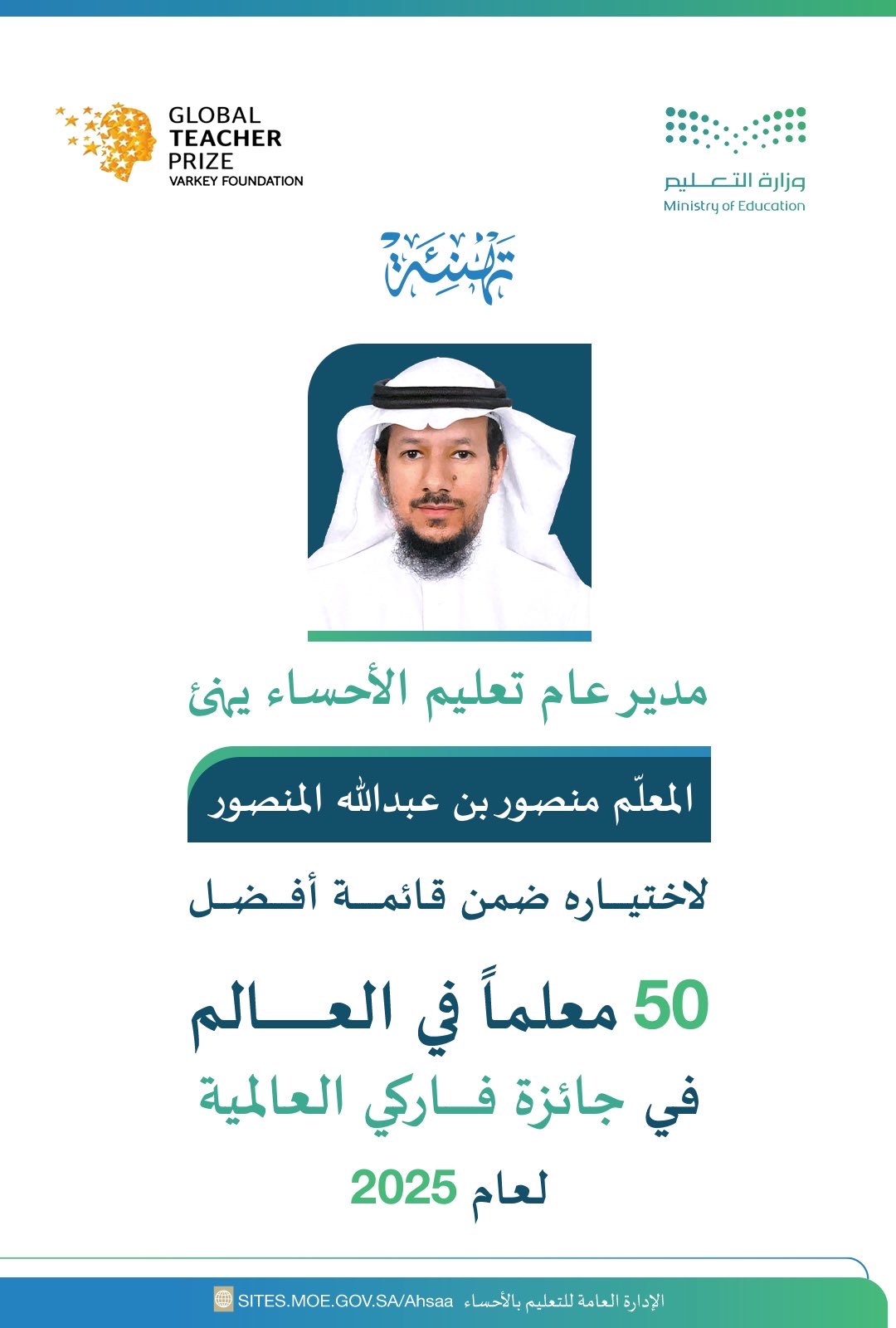 ن جهته، هنأ مدير الإدارة العامة للتعليم بالأحساء حمد العيسى، المعلم المنصور بهذا الإنجاز، الذي يعد ثمرة من ثمار الاهتمام والرعاية والدعم للتعليم ومنسوبيه من القيادة الرشيدة، منوهًا بجهوده وتميزه في مجال عمله، ليكون خير ممثل لمعلمي المملكة.