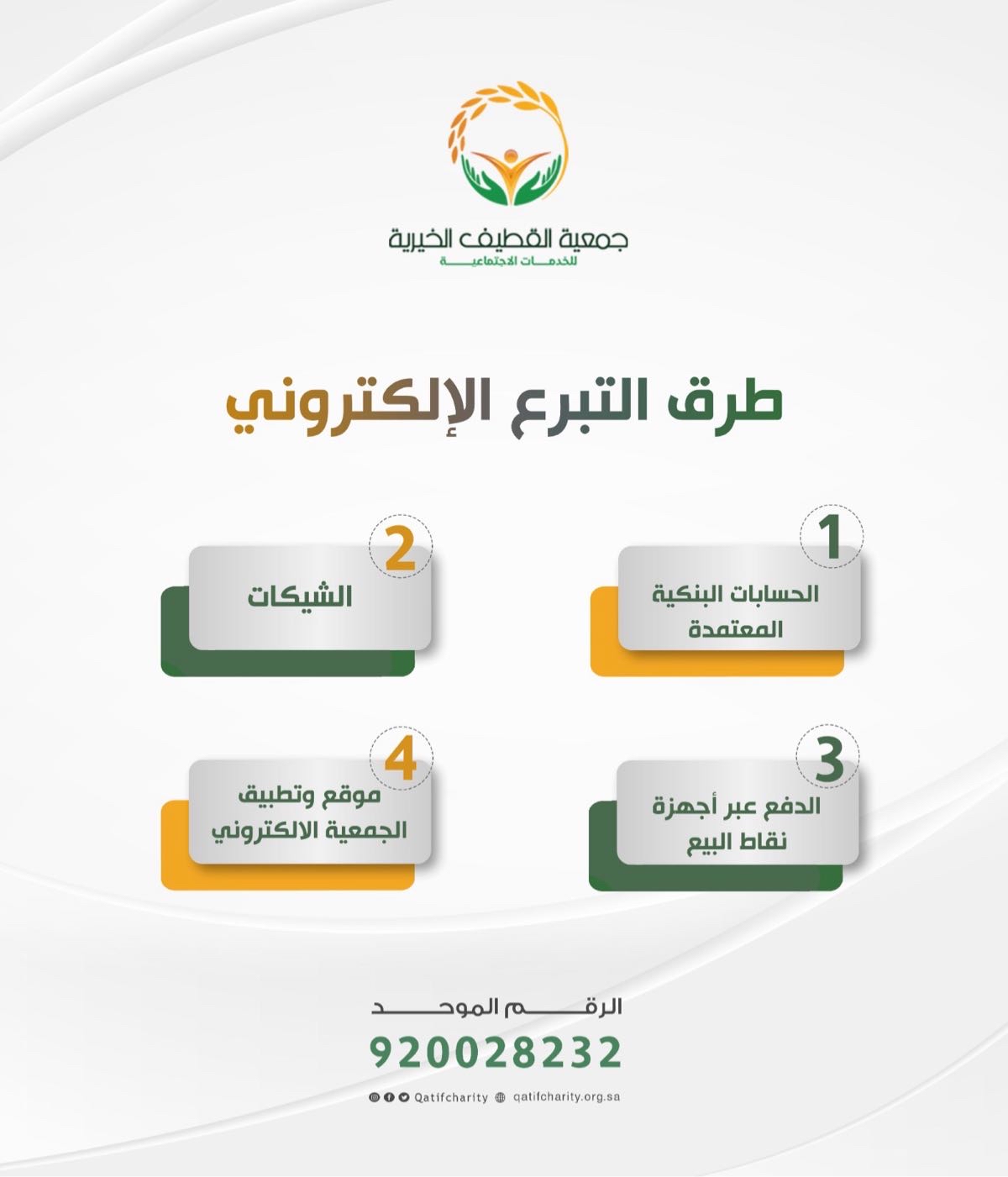 ودعت الجمعية الراغبين في معرفة المزيد حول وسائل الدفع الإلكتروني المتاحة للصدقات والتبرع للمشاريع والمبادرات التي تعمل عليها، إلى التواصل عبر الهاتف الموحد ”920028232“ أو زيارة الموقع الإلكتروني: qatifcharity.org.sa.