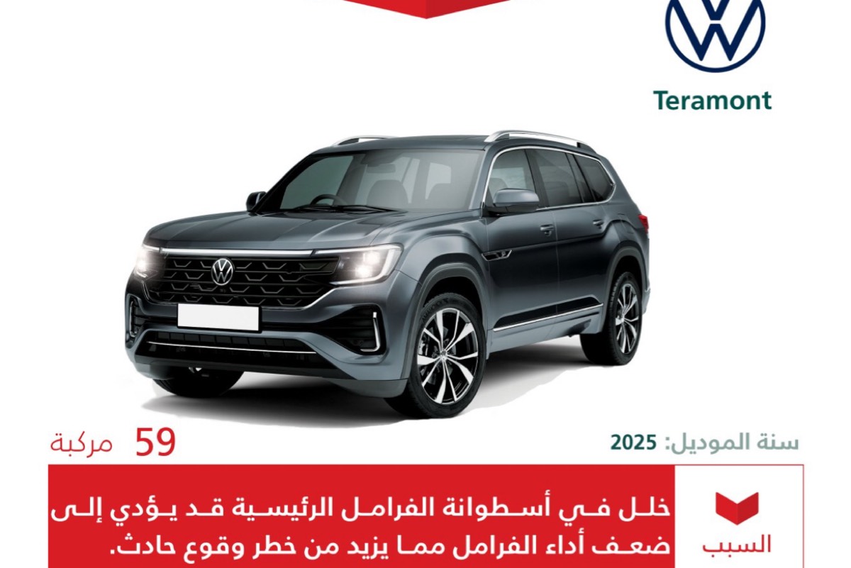أعلنت وزارة التجارة اليوم عن استدعاء 59 مركبة من طراز ”فولكس واجن تيرامونت“ موديل 2025، وذلك بسبب وجود خلل في أسطوانة الفرامل الرئيسية قد يؤدي إلى ضعف أداء الفرامل، مما يزيد من خطر وقوع حوادث.