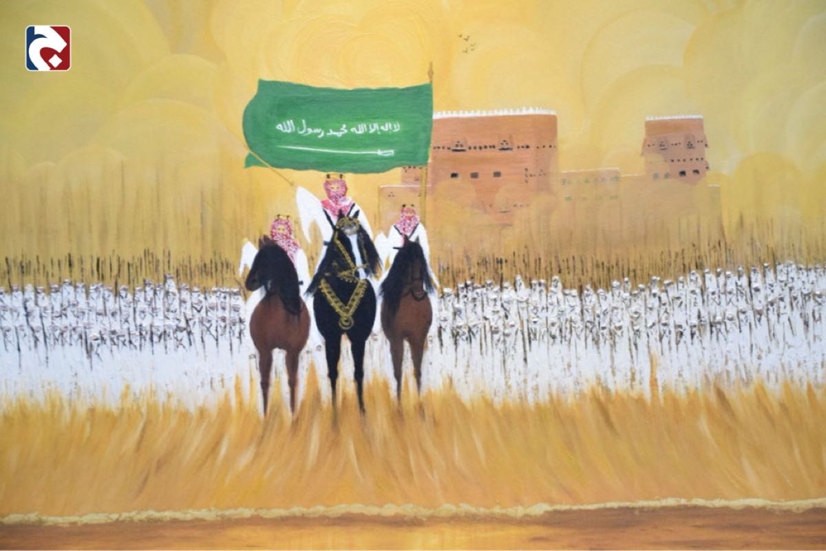 وأوضح أن لوحته بهذه المناسبة تتضمن عنصرًا أساسيًا هو قصر الدرعية، منبت الدولة السعودية، وكأنه يشرف على انطلاق الراية التي خرجت من هناك وستظل مرفوعة بأيدي أبنائها.