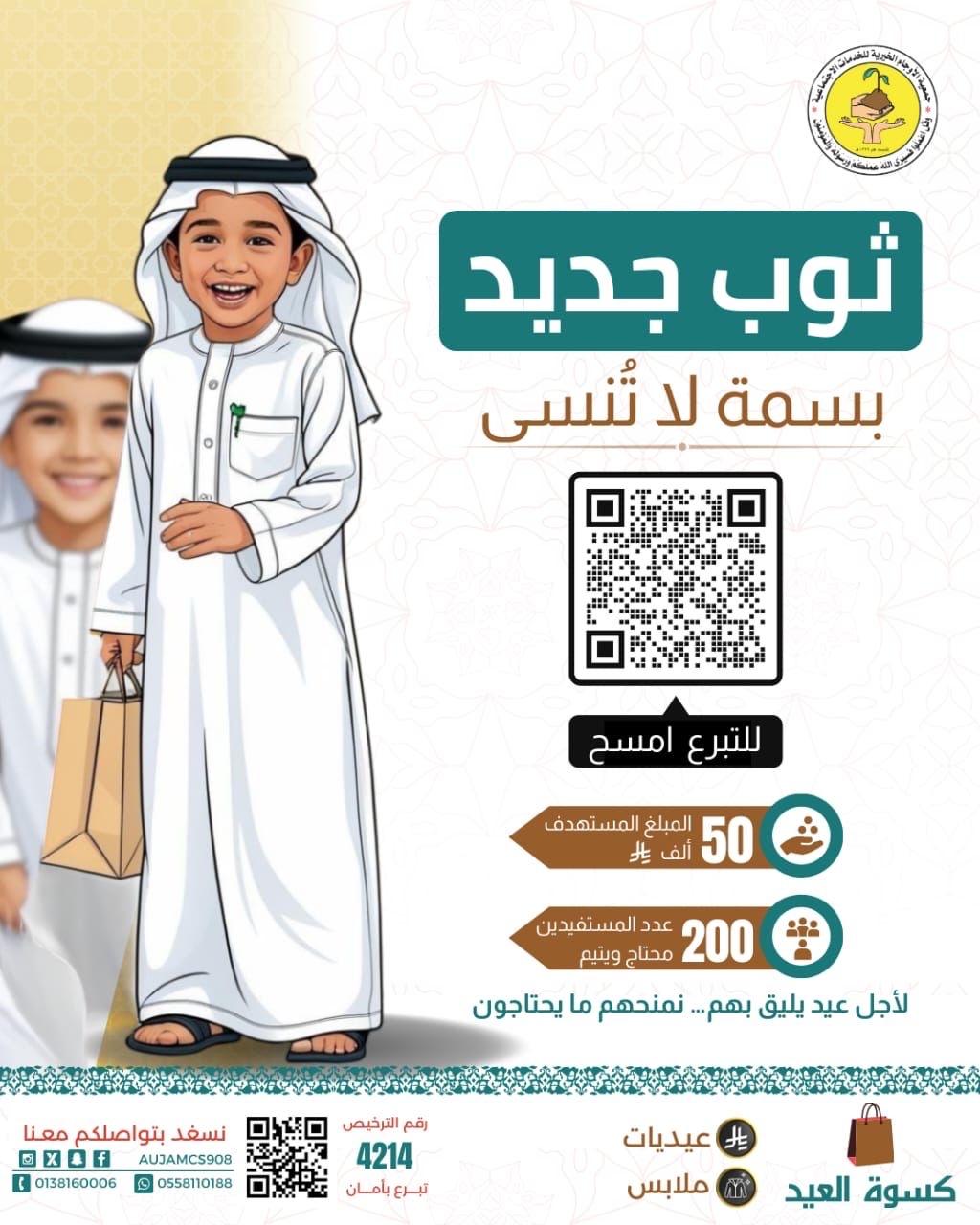 ويمكن للمهتمين بالتبرع لمشروع ”كسوة العيد“ زيارة الرابط التالي: https://alaujam.org.sa/s/tckI1ju02ed.