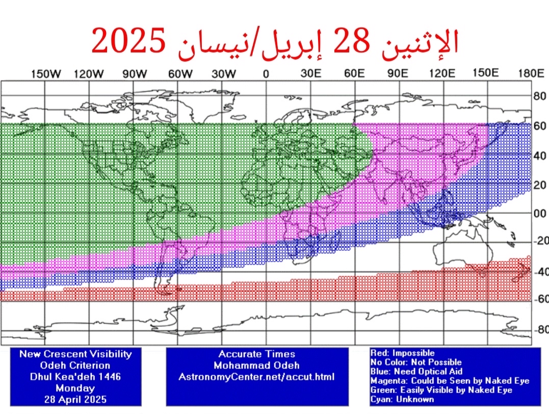 وأضاف أن هذه المدة التي يمكثها الهلال فوق الأفق بعد غروب الشمس، بالإضافة إلى عمره الذي سيبلغ 19 ساعة عند الغروب، ونسبة إضاءته التي ستصل إلى 1,09%، وارتفاعه عن الأفق البالغ 11,36 درجة، وزاوية استطالته «البعد الزاوي عن الشمس» التي ستبلغ 12,38 درجة، كلها عوامل تجعل من رؤية الهلال بالعين المجردة أمراً ”ممكناً“ في حال كانت الظروف الجوية صافية وخالية من العوائق البصرية كالسحب أو الغبار في منطقة الرصد.
