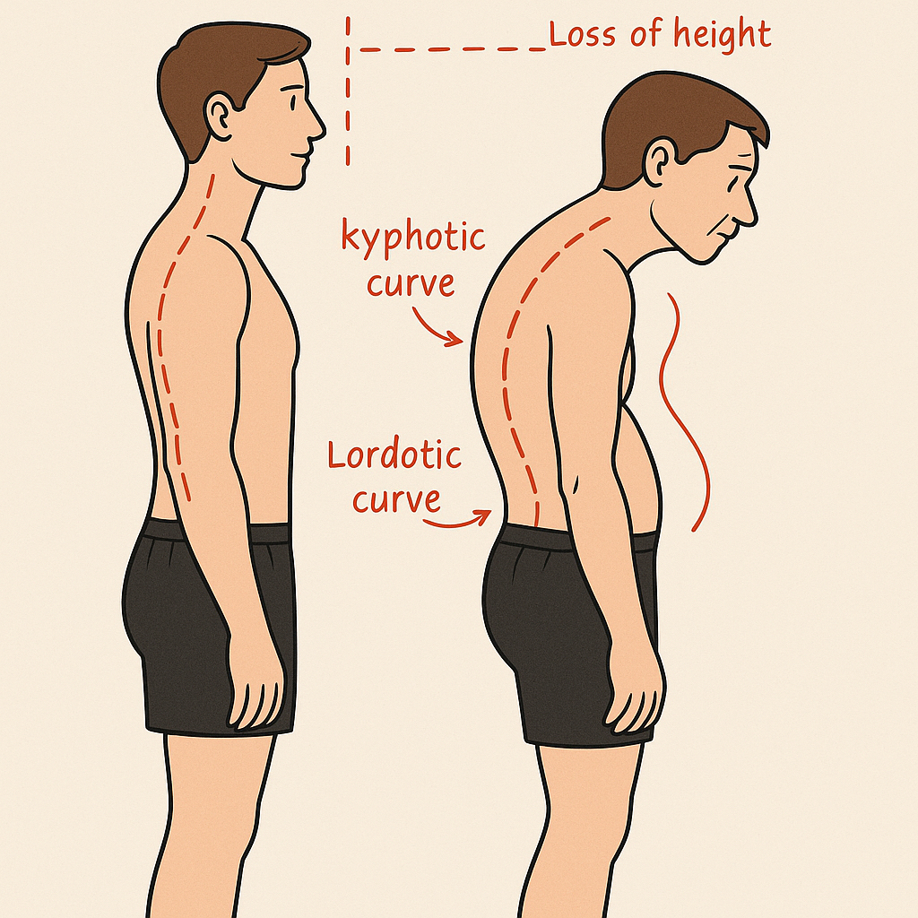 • نقص في طول القامة «أي نقص يبلغ أطول من 3 إلى 4 سنتيمترات مقارنة بطول القامة الأقصى في مرحلة الرشد «18 أو 20 سنة وأكبر» قد يُعتبر خارج نطاق النقص بسبب الشيخوخة ”الطبيعية“».