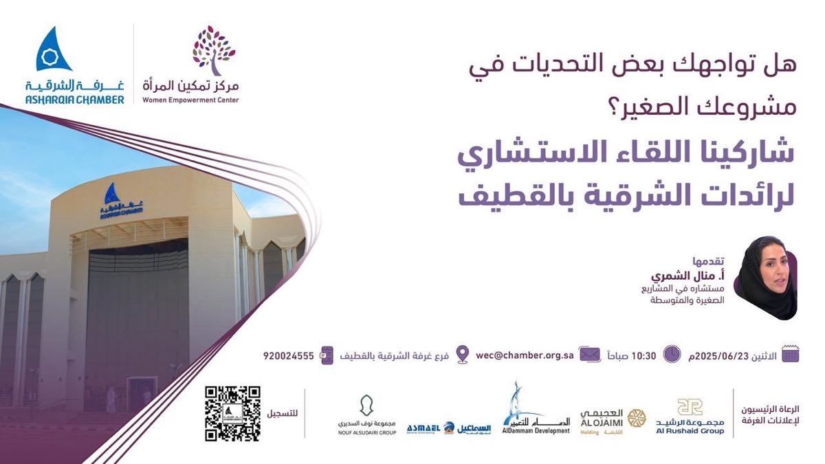 تنظم غرفة الشرقية، ممثلة في مركز تمكين المرأة، عن تنظيم لقاء استشاري لرائدات بمحافظة القطيف.