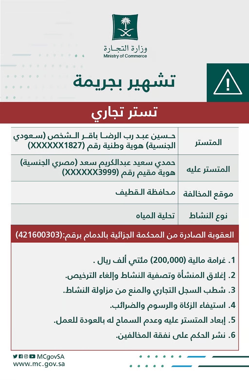 شهرت وزارة التجارة بمواطن سعودي ومقيم من الجنسية المصرية، وذلك بعد صدور حكم قضائي نهائي من المحكمة الجزائية بالدمام، يدينهما بارتكاب جريمة التستر التجاري في نشاط مؤسسة تعمل في مجال تحلية المياه بمحافظة القطيف.