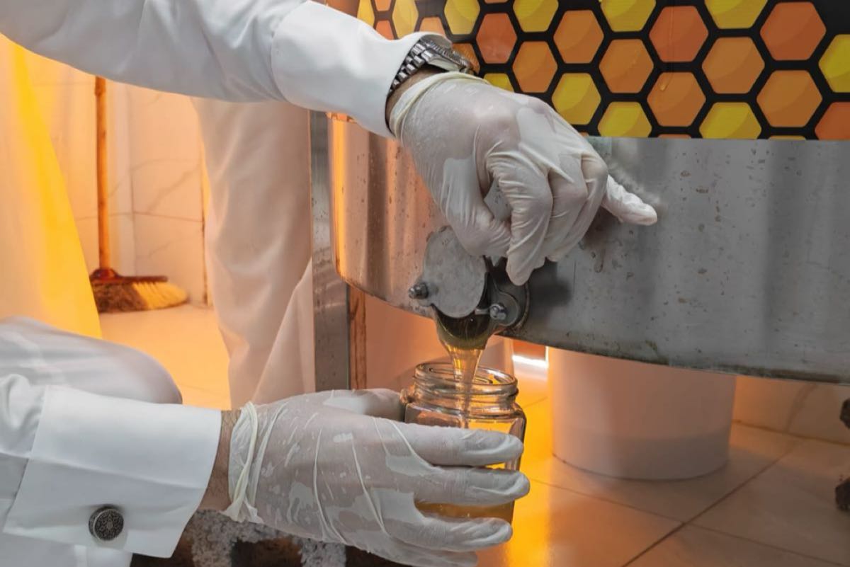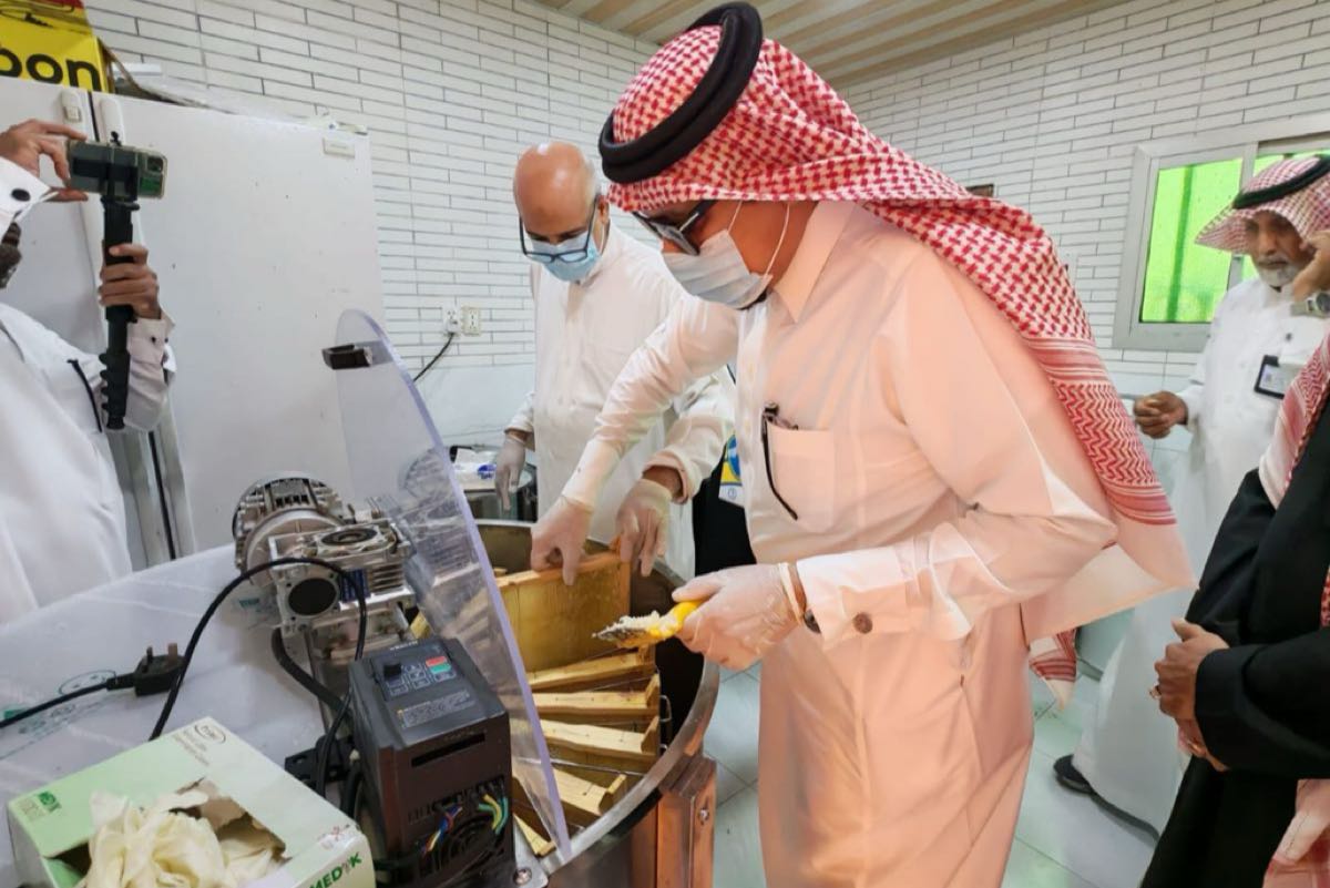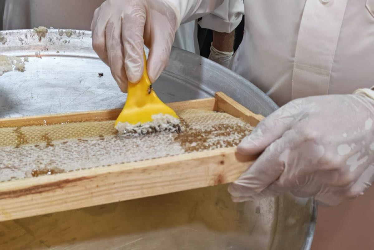 وتابع المهندس الأصمخ ومرافقوه عن كثب المراحل الدقيقة لعملية الفرز، بدءًا من كشط الأغطية الشمعية عن عيون العسل، مرورًا بوضع البراويز في آلات الفرز الآلية التي تعمل بالطرد المركزي، وصولًا إلى تجميع العسل وقياس نسبة الرطوبة فيه.