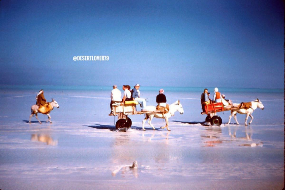 وتُظهر الصورة مجموعة من الزوار الأجانب أثناء تنقلهم على ظهر ”القاري“ وسط المسارات الرملية التي كانت تظهر عند انحسار البحر، ما يُبرز مشهدًا فريدًا من حياة أهل الساحل في المنطقة الشرقية، قبل تشييد الجسور وشبكات الطرق الحديثة.