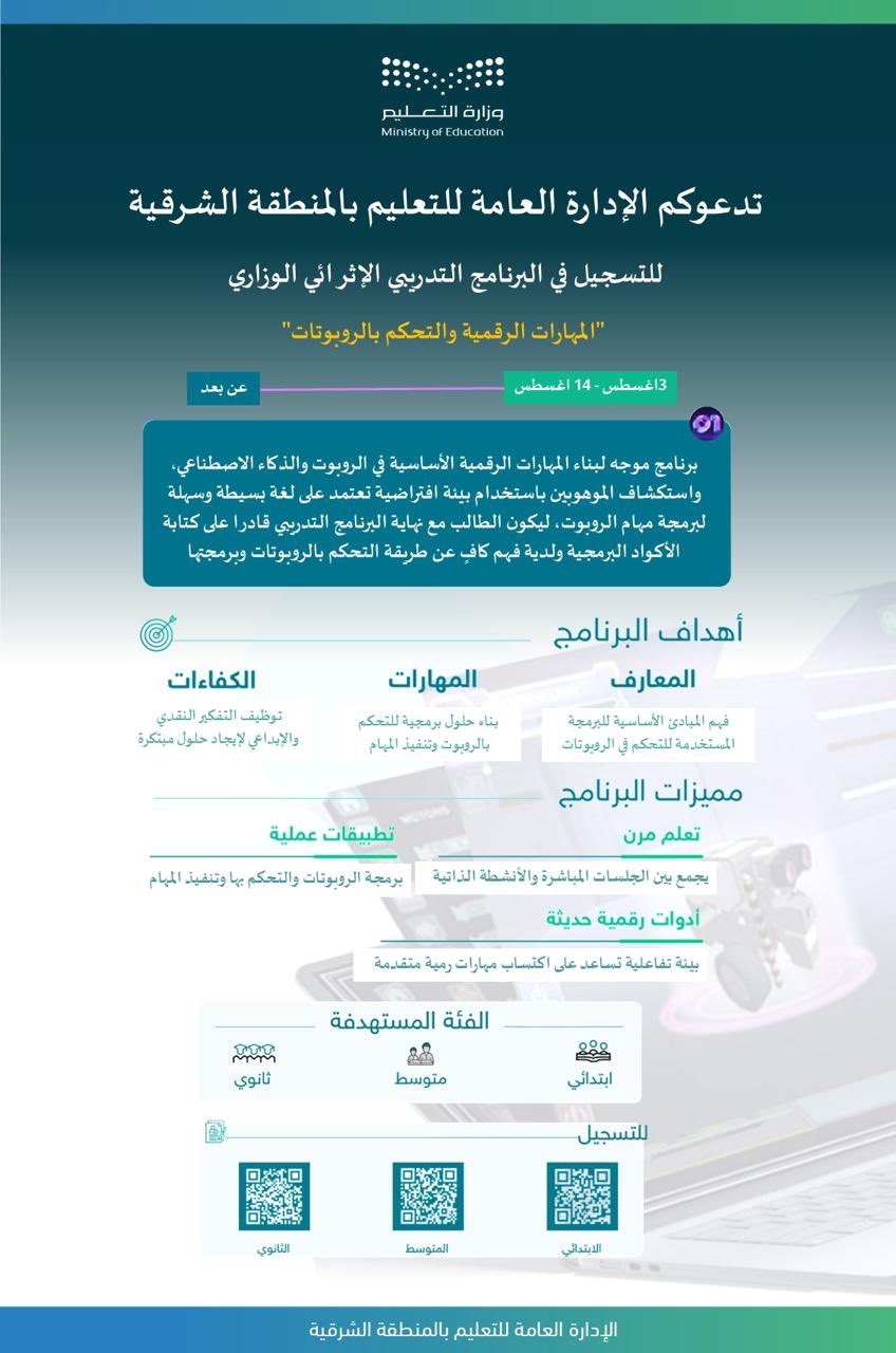 أعلنت الإدارة العامة للتعليم بالمنطقة الشرقية عن بدء التسجيل في البرنامج التدريبي الوزاري الإثرائي ”المهارات الرقمية والتحكم بالروبوتات“، الذي يُقام عن بُعد خلال الفترة من 13 إلى 14 أغسطس المقبل.