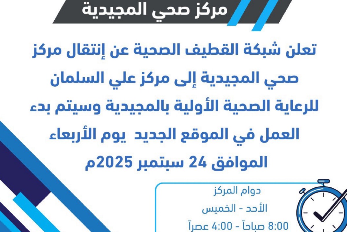 أعلنت شبكة القطيف الصحية عن انتقال مركز صحي المجيدية بكامل خدماته إلى مقره الجديد في مركز علي السلمان للرعاية الصحية الأولية الواقع في حي المجيدية.