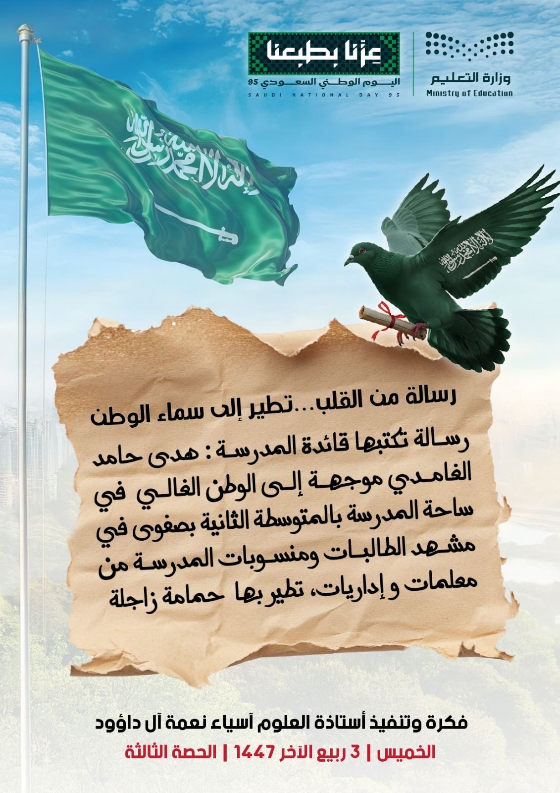 وجاءت هذه الفعالية، التي حملت عنوان ”رسالة من القلب… تطير إلى سماء الوطن“، بفكرة وتنفيذ من معلمة العلوم آسياء آل داؤود، بهدف غرس قيم الانتماء والولاء في نفوس الطالبات والهيئة التعليمية بطريقة إبداعية ومؤثرة.