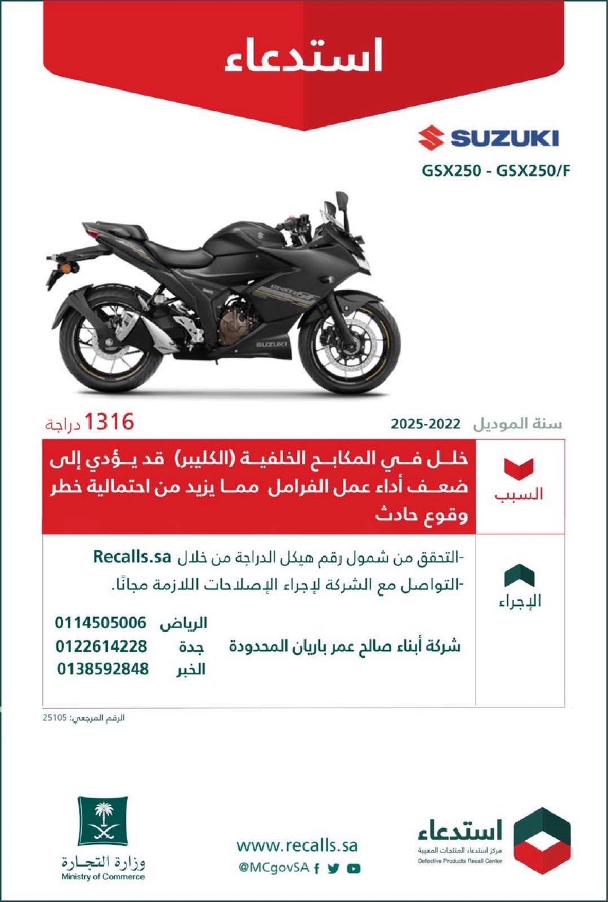 أعلنت وزارة التجارة عن استدعاء 1,316 دراجة نارية من طراز ”سوزوكي GSX250“ و”GSX250/F“، والتي تشمل الموديلات المصنعة بين عامي 2022 و 2025. في إجراء عاجل يهدف إلى ضمان سلامة قائدي الدراجات النارية.