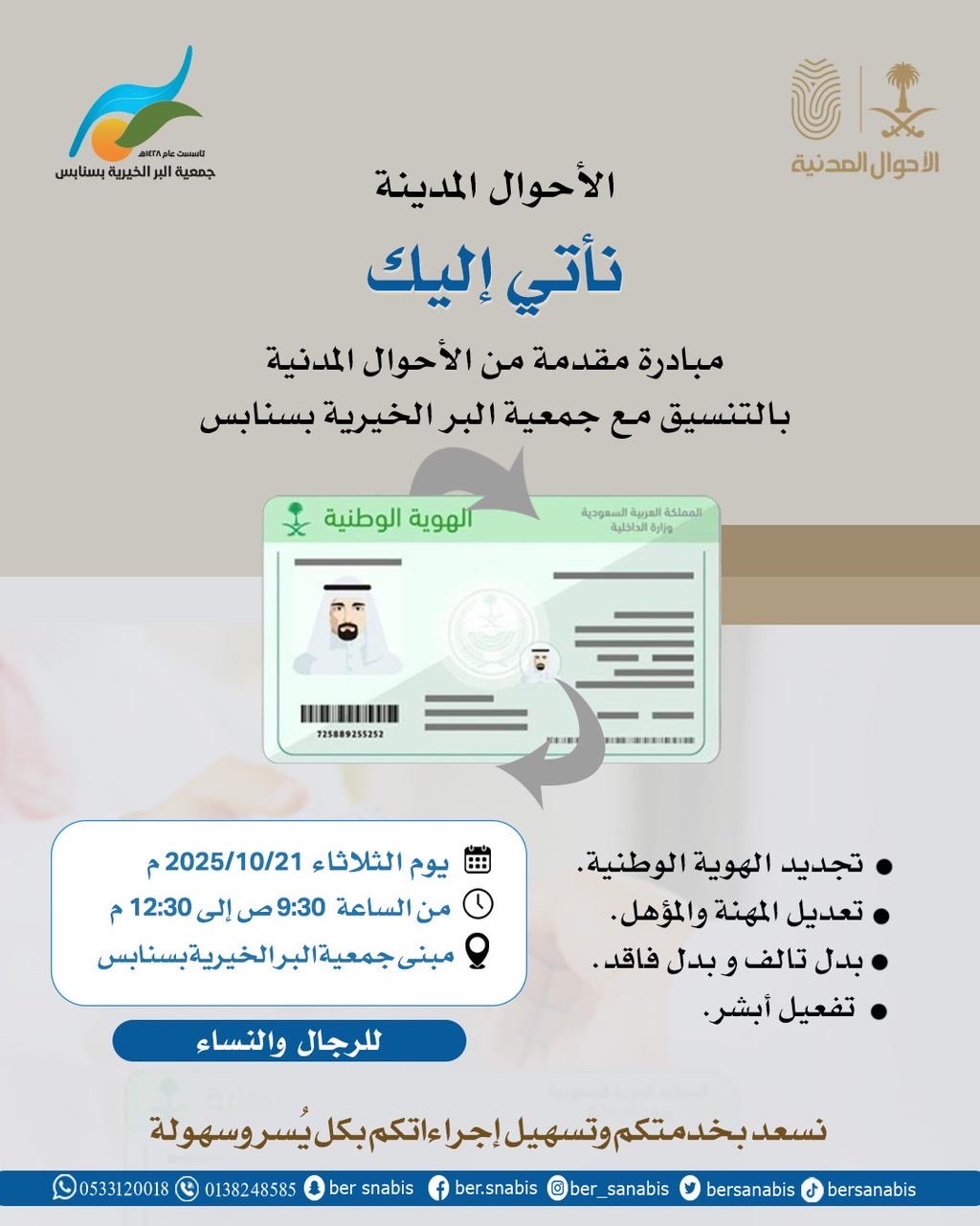 تستضيف جمعية البر الخيرية بسنابس مبادرة ”نأتي إليك“، التي تنفذها وكالة وزارة الداخلية للأحوال المدنية، حيث سيتم تقديم حزمة من الخدمات الأساسية للمستفيدين في مقر الجمعية يوم الثلاثاء 28 أكتوبر 2025.
