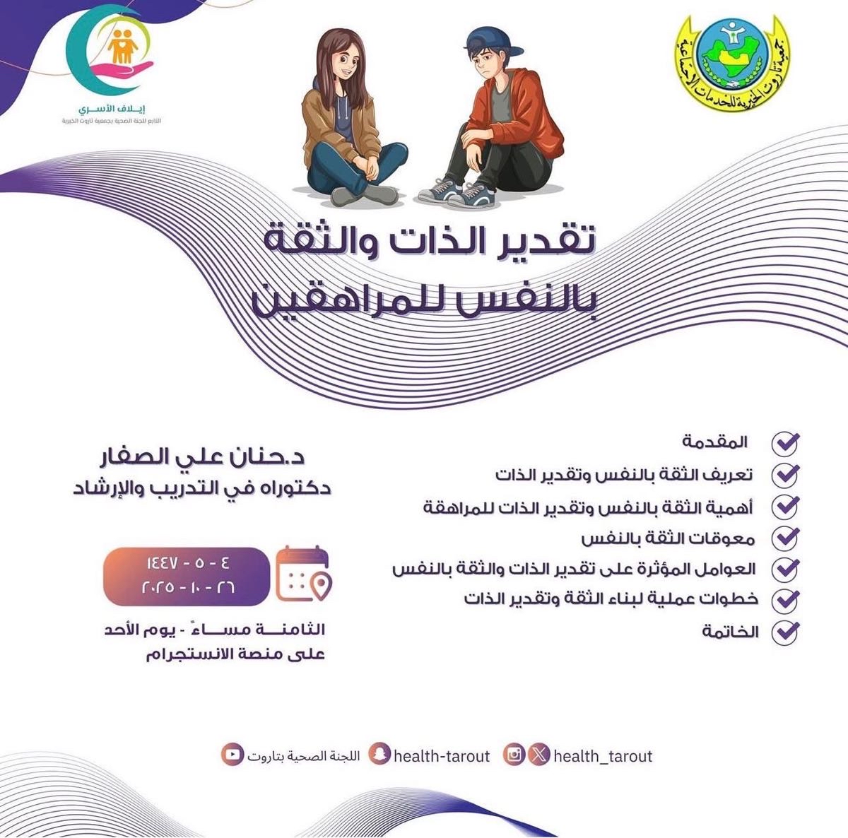 ينظم برنامج ”إيلاف الأسري“، التابع للجنة الصحية بجمعية تاروت الخيرية، مساء اليوم الأحد، محاضرة توعوية متخصصة بعنوان ”تقدير الذات والثقة بالنفس للمراهقين“.