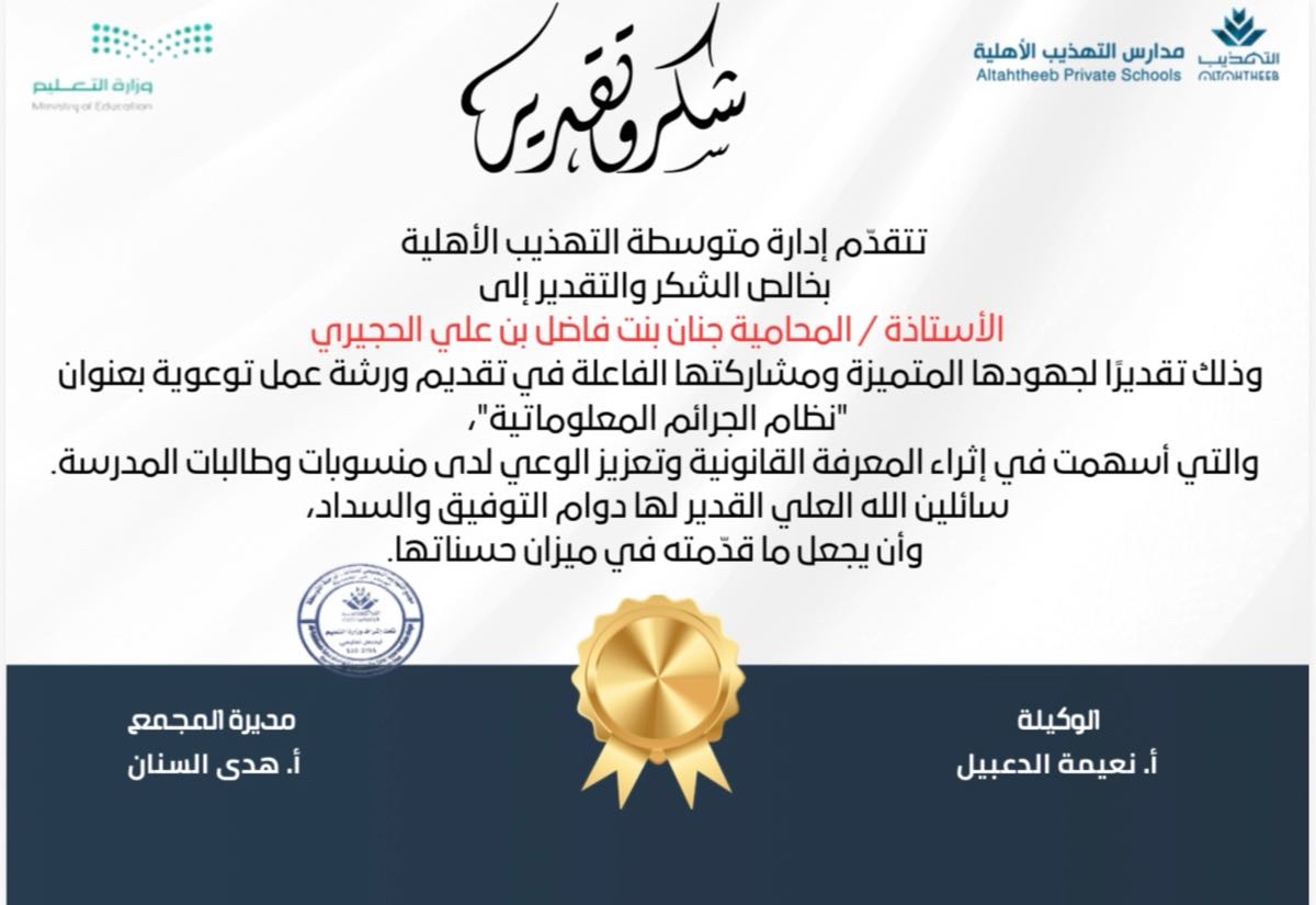 وفي الختام، قدمت مديرة المدارس، هدى السنان، شهادة شكر وتقدير للمحامية جنان آل حجيري تقديراً لهذه المبادرة التوعوية.