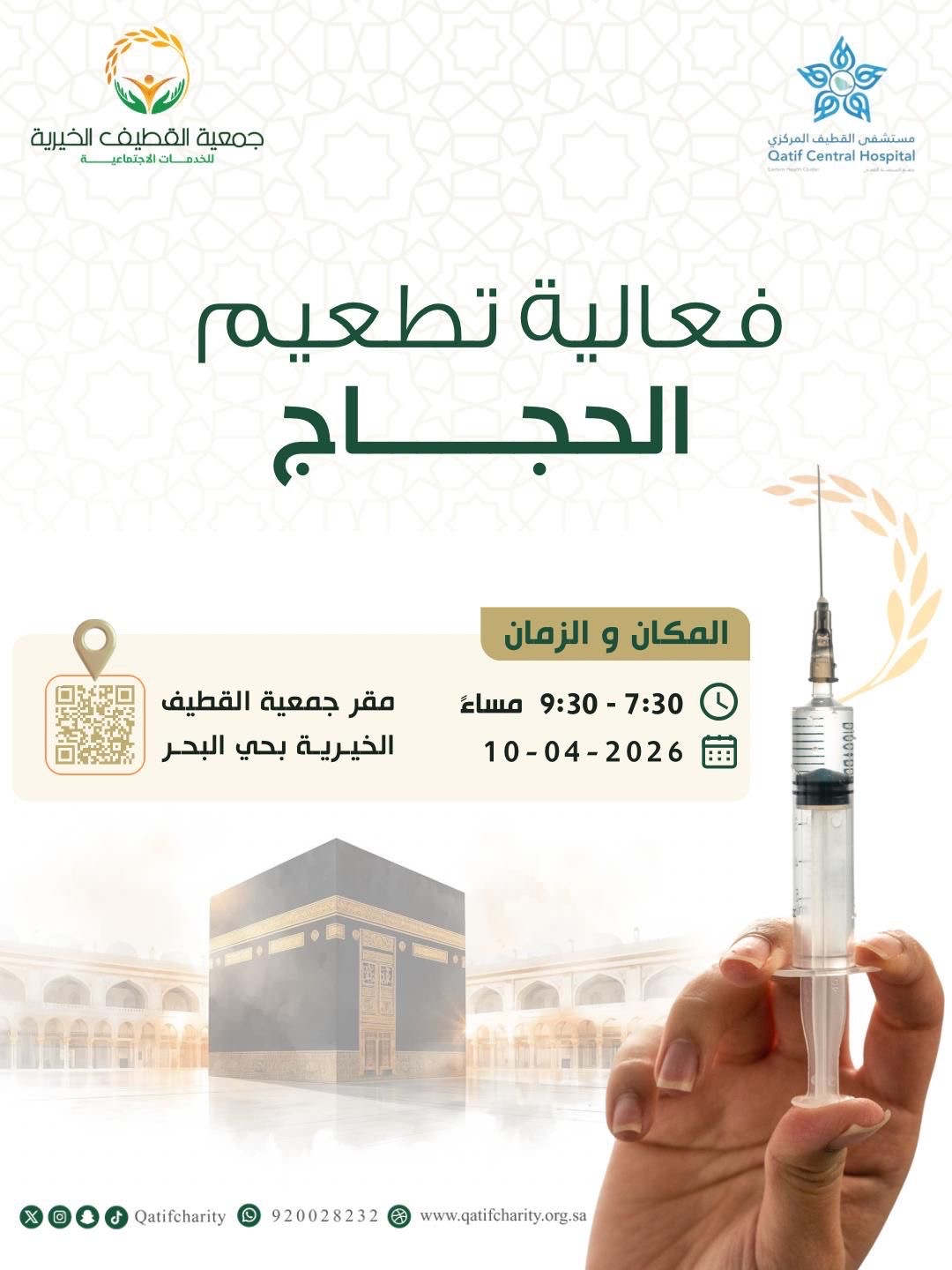 تطلق جمعية القطيف الخيرية، بالشراكة مع مستشفى القطيف المركزي، مساء الجمعة، فعالية صحية لتطعيم حجاج موسم 1447 هـ بمقرها في حي البحر، بهدف تعزيز الجاهزية الوقائية عبر كوادر طبية متخصصة.