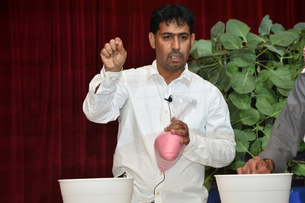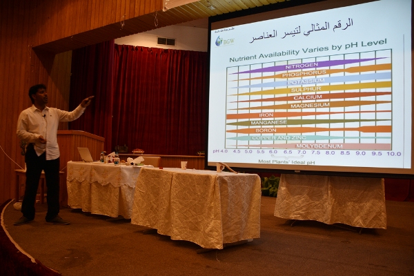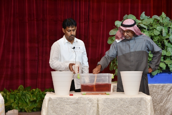 واستعرض بعض مقاطع الفيديو التي توضح نماذج بيئة الزراعة المائية كنظام البرج والنظام المغلق وتقنياته، ومنها «دوتش بكيت» الذي يمكن زراعة أغلب الثمار به كالطماطم والخيار والفلفل.