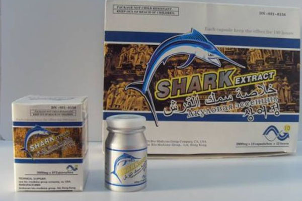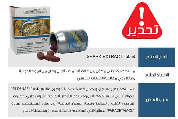 وأوضحت ”الهيئة“ أن مفتشيها رصدوا مستحضر «SHARK EXTRACT Tablet»، الذي اتضح أنه غير مسجل، ويحمل ادعاءات مضللة، وجرى غشه بمواد دوائية، ويسوق من باعة متجولين ومواقع على شبكة الانترنت ومواقع التواصل الاجتماعي على أنه مستحضر طبيعي مكون من خلاصة سمك القرش وخالٍ من المواد الدوائية وفعّال لمعالجة الضعف الجنسي، في حين أن هذا الادعاء مضلل وليس له أي أساس من الصحة، إذ أظهرت التحاليل غش المستحضر بمادة ”SILDENAFIL“ الدوائية التي لا تستخدم إلا بموجب وصفة طبية، وتحت إشراف طبي، خصوصاً لمرضى القلب والضغط وكبار السن، إضافة إلى غش المستحضر بمادة ”PARACETAMOL“ الدوائية التي تستخدم خافضةً للحرارة ومسكنةً للألم.مستحضر خلاصة سمك القرش