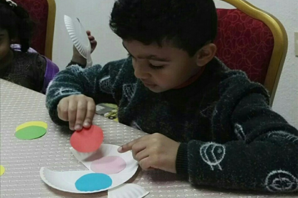 وتفاعل الأطفال في مجال الرسم والتلوين مستخدمين أسلوب التوصيل بالنقاط والتلوين بالرمل الملون، وألوان الباستيل وكذلك الرسم الحر باستخدام الألوان المائية.