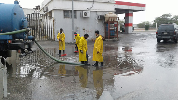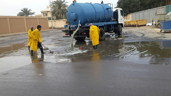 وأوضح ان العمل يبدأ خلال هطول الأمطار مباشرة وبعد عملية المسح المسبق لمعرفة كثافة المطر بالأحياء والشوارع، وحصر جميع نقاط تجمع المياه حيث كانت الأولوية لمداخل المدن ومواقع اشارات المرور والمدارس والاسواق والأماكن التي تتجمع فيها المياه بكميات غزيرة وخاصة تقاطع الطرق والمنافذ والشوارع الرئيسية حسب الأولوية.