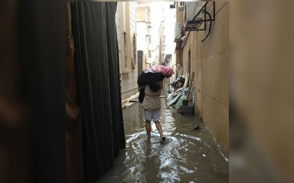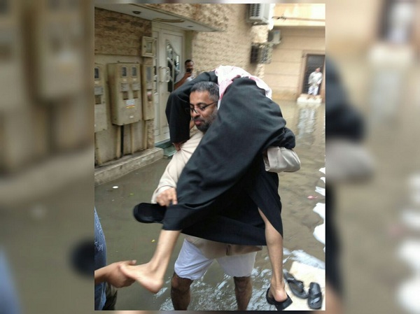 لجأ الشاب سامي آل هلال من بلدة أم الحمام إلى حمل والده المؤذن على كتفيه مسافة 200 متر في الطرقات الغارقة، ليقيه من مياه الأمطار المتراكمة ناحية مسجد المرتضى بحي القوع، بعد أداء صلاة الجمعة، في لقطة وثقتها عدسة الهاتف النقال على حين غفلة منه، مجسدًا فيها معاني بر الوالدين.