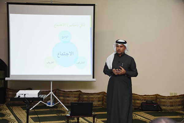 وناقش مراحل الاجتماع، المعنية ب " قبل وأثناء وبعد"، معرفاً المتدربين بأهمية المحافظة على الوقت اثناء الاجتماع والالتزام به.