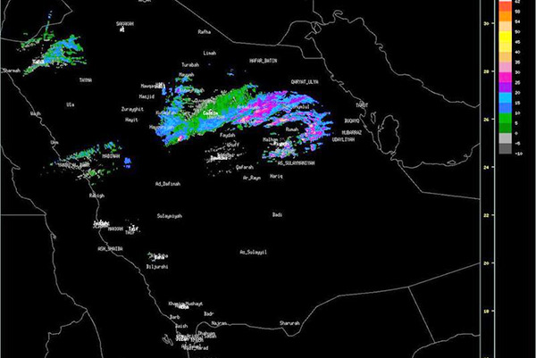 بث النظام الآلي للإنذار المبكر صورة رادار توضح وجود السحب الرعدية الممطرة على مناطق: الرياض، والقصيم، والشرقية، والمتوقع استمرارها، وفق ما أكده النظام التابع لهيئة الأرصاد.
