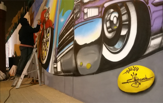 شارك الرسّام فؤاد الغريب - من أهالي الأحساء - برسم لوحة جدارية بزاوية عين السمكة في مهرجان «الشارع الثقافي» في العاصمة الرياض، الذي أنطلق يوم الإثنين الماضي بتنظم أمانة منطقة الرياض وحضور أمير الرياض فيصل بن بندر.