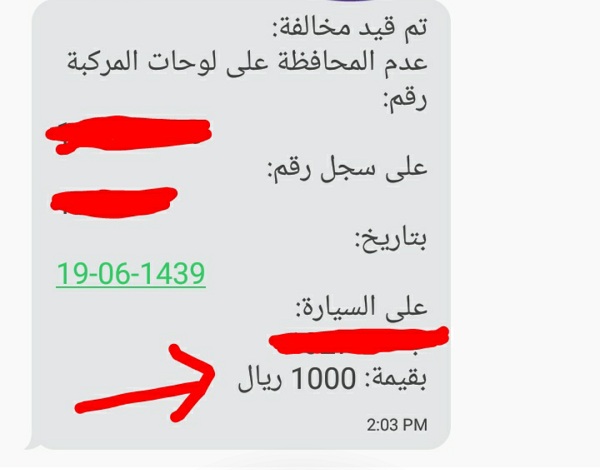 تفاجأ مواطن بتحرير مخالفة مرورية ضده؛ وأنه ملزم بدفع 1000 ريال؛ بسبب أن الغبار أثر على لوحة مركبته الأمامية.