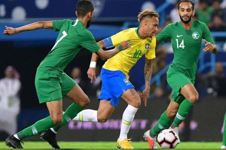 واحرز البرازيل هدفه الاول عبر جيسوس في الدقيقة 44، وقبل نهاية الوقت الاصلي بخمس دقائق وبإستعانة من تقنية الفيديو طرد حكم اللقاء حارس المنتخب السعودي محمد العويس.
