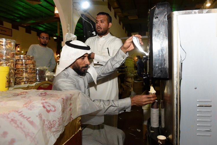 توافد زوار مهرجان تسويق التمور بالأحساء لاسيما الأطفال على ”آيسكريم الدبس“، والذي عرضه صاحب أكبر مصنع إنتاج لدبس التمر على مستوى المملكة محمد بن قوطي.