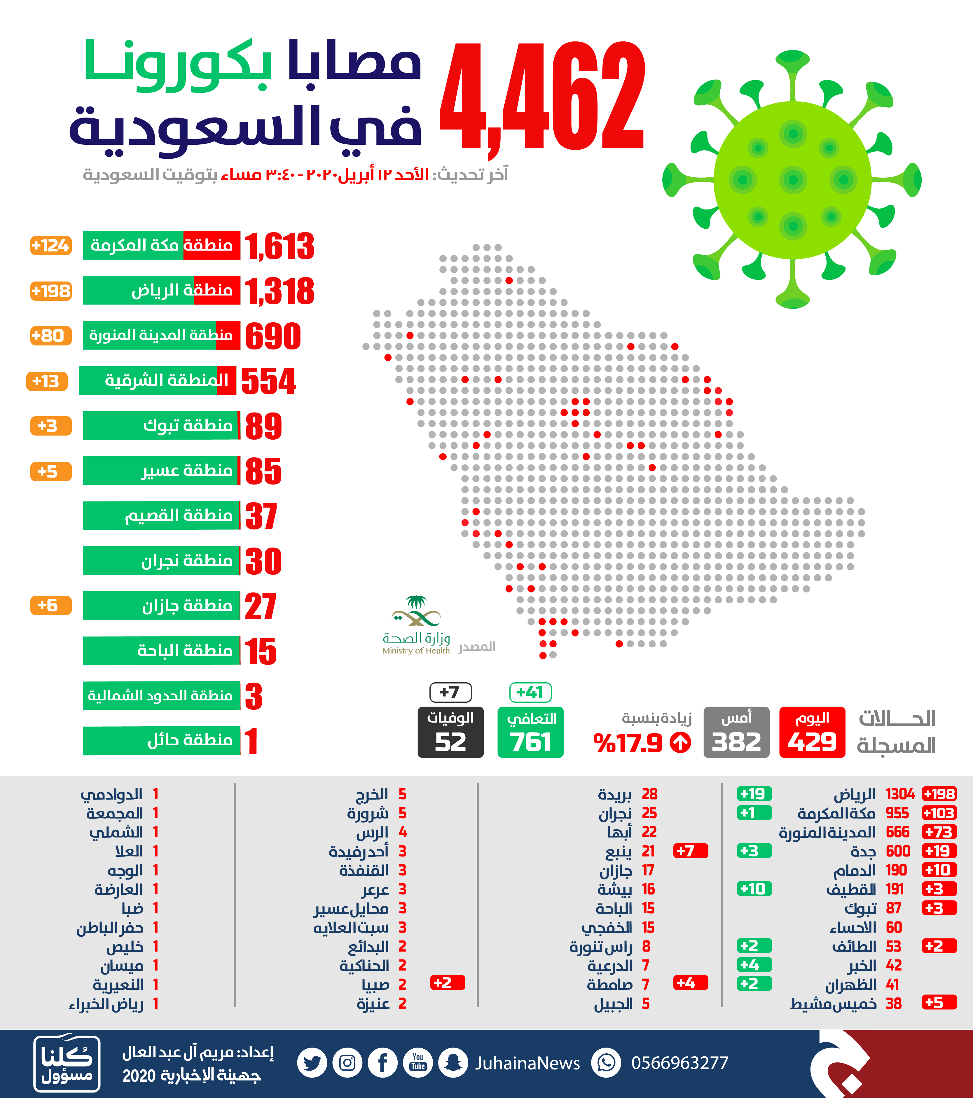 متحدث #وزارة_الصحة : إجمالي الحالات في المملكة 4462 حالة، بينها 3642 حالات نشطة، وحوالي 65 حالة حرجة تتلقى العناية المركزة.