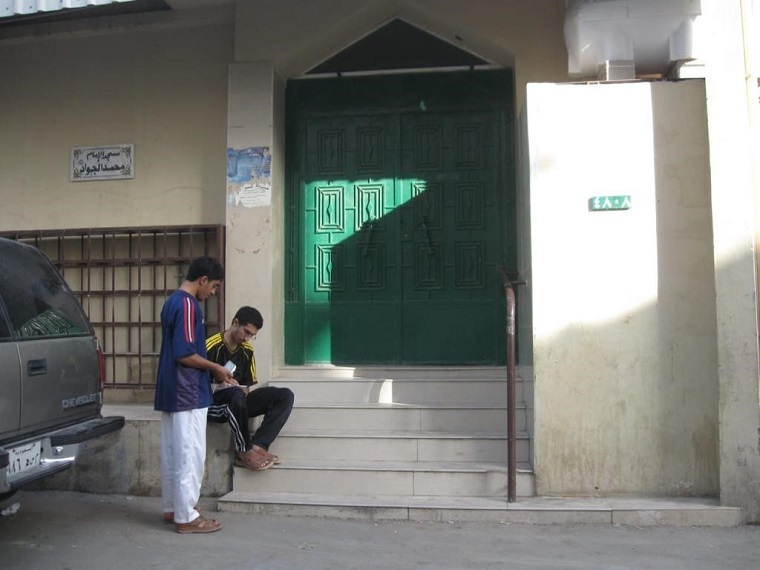 بوابة المسجد بعد الترميم الأخير قبل اكتمال بناءه، وبجواره موضع البيت الذي كان ينزل فيه الشيخ عبد المحسن اللويمي