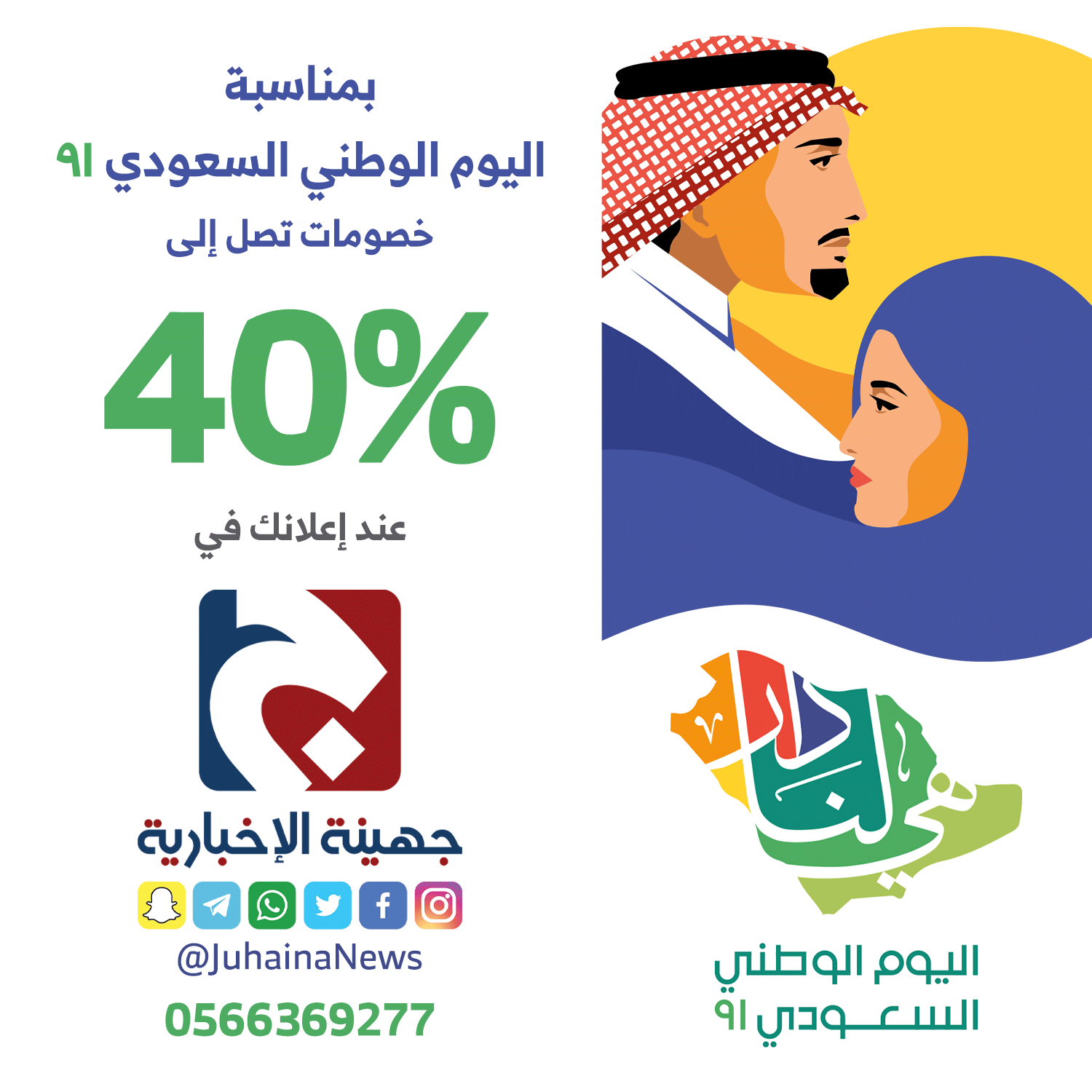 عرض اليوم الوطني.. خصومات تصل إلى 40% عند إعلانك في جهينة جهات الإخبارية 11 / 9 / 2021م - 8:10 م للإعلان والاستفسار عن الباقات المميزة تواصل معنا على 0566369277 [email protected]