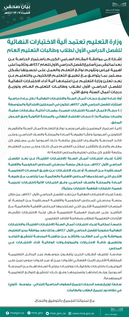 خامسًا: إمكانية إجراء اختبارات أعمال السنة «الاختبارات الفترية»، والاختبارات النهائية حضورية للفصل الدراسي الأول» وذلك بعد موافقة مدير التعليم وموافقة ولي أمر الطالب، والتأكد من جاهزية المدرسة لتحقيق التباعد التطبيق كافة الاحترازات والبروتوكولات الوقائية لأداء الاختبارات في المدارس.