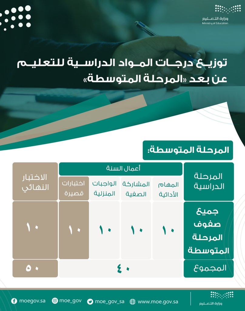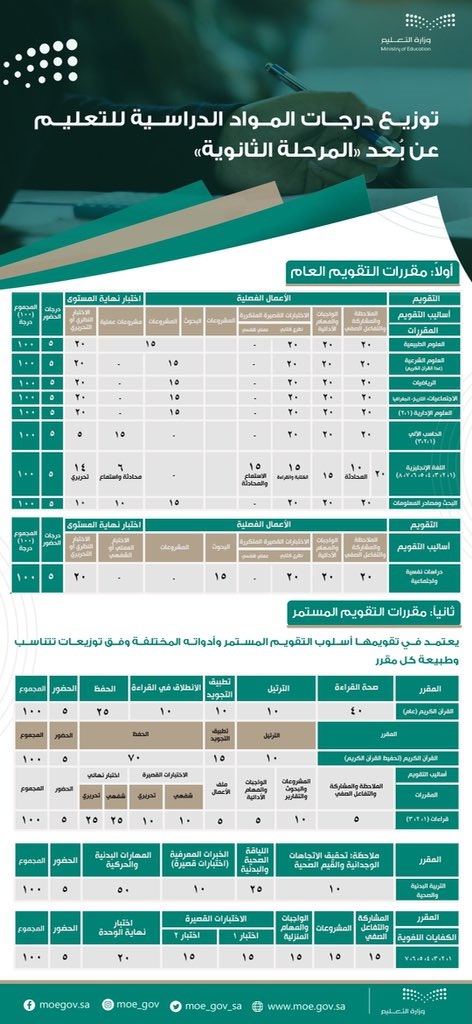 أولًا: إعادة توزيع درجات أعمال السنة والاختبارات النهائية لكل مادة دراسية استثناء للفصل الدراسي الأول معًا لتكون في المرحلتين الابتدائية والمتوسطة «40 درجة» لأعمال السنة «اختبارات قصيرة، مهمات أدائية، مشاركات صفية واجبات منزلية» و«1» درجات للاختبار النهائي، والمرحلة الثانوية وفق الجدول المرفق.