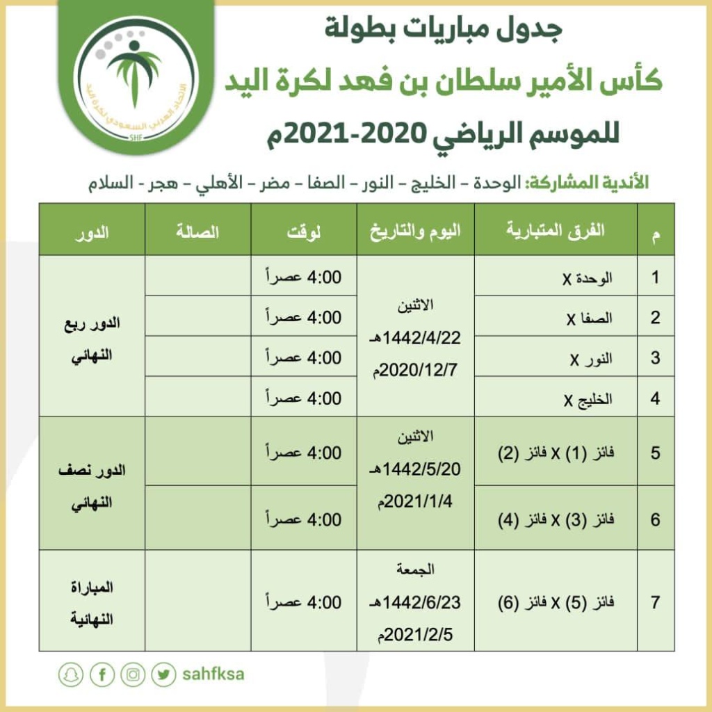 حدد الاتحاد السعودي لكرة اليد موعد إجراء قرعة بطولة كأس الأمير سلطان بن فهد بنسختها الثالثة والأربعون للموسم الرياضي 2020 - 2021م، وذلك يوم الثلاثاء المقبل، عند تمام الساعة الرابعة عصراً، بمقر الاتحاد بمجمع الأمير فيصل بن فهد الأولمبي بالرياض.