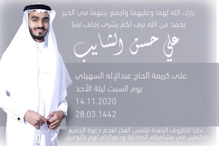 وعبر العريس عن سعادته الغامرة بدخوله القفص الذهبي، ملتمسا العذر عن عدم اقامة حفل زفاف نتيجة ظروف الجائحة القائمة، سائلا الله أن يوفقه وعروسه ويرزقهما الذرية الصالحة.