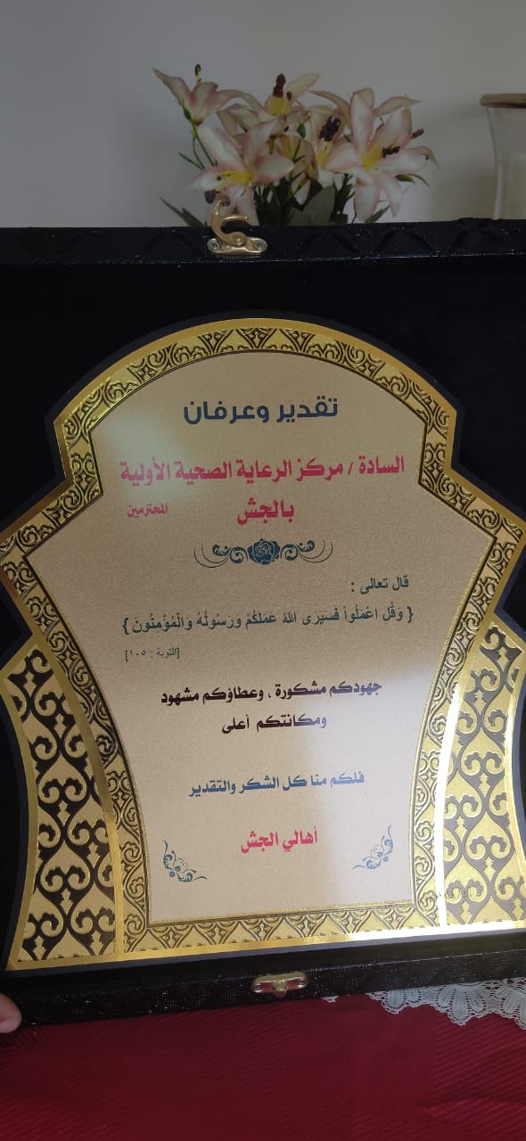 كرم أهالي مدينة الجش بالقطيف الكادر الطبي في مركز الرعاية الصحية الأولية بالجش لجهودهم في مكافحة فايروس كورونا المستجد.