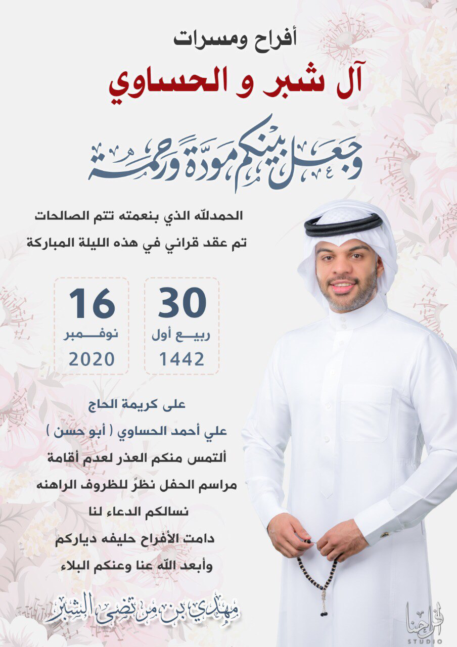 احتفلت عائلة آل شبر والحساوي في صفوى مساء يوم الإثنين بعقد قران الشاب مهدي مرتضى آل شبر على كريمة الحاج علي أحمد الحساوي وسط فرحة الأهل والأصدقاء ومحبي العريسين.