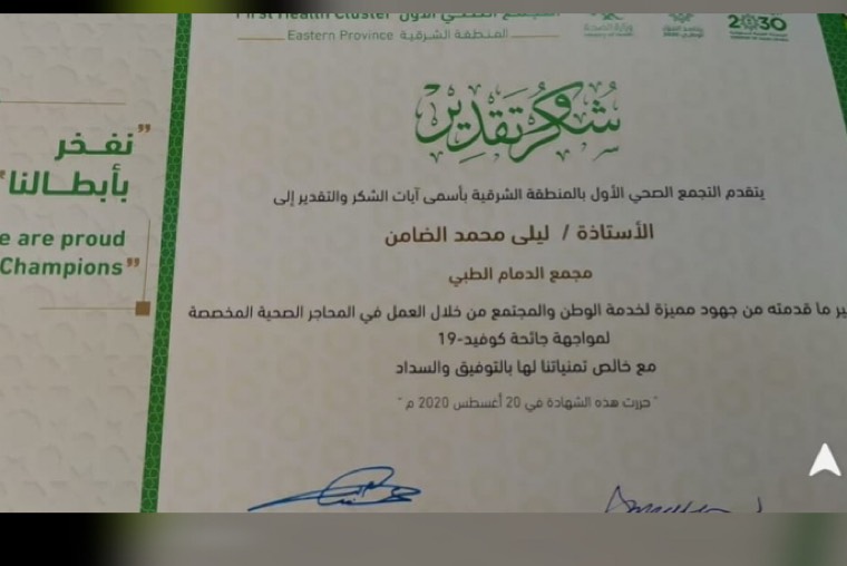 كرم التجمع الصحي الأول بالمنطقة الشرقية رئيسة قسم صحة البيئة بمجمع الدمام الطبي أخصائية مكافحة العدوى ليلى محمد حسن الضامن. بشهادة شكر وتقدير نظير ما قدمته من جهود مميزة لخدمة الوطن والمجتمع من خلال العمل بالمحاجر الصحية المخصصة لمواجهة جائحة كوفيد -19