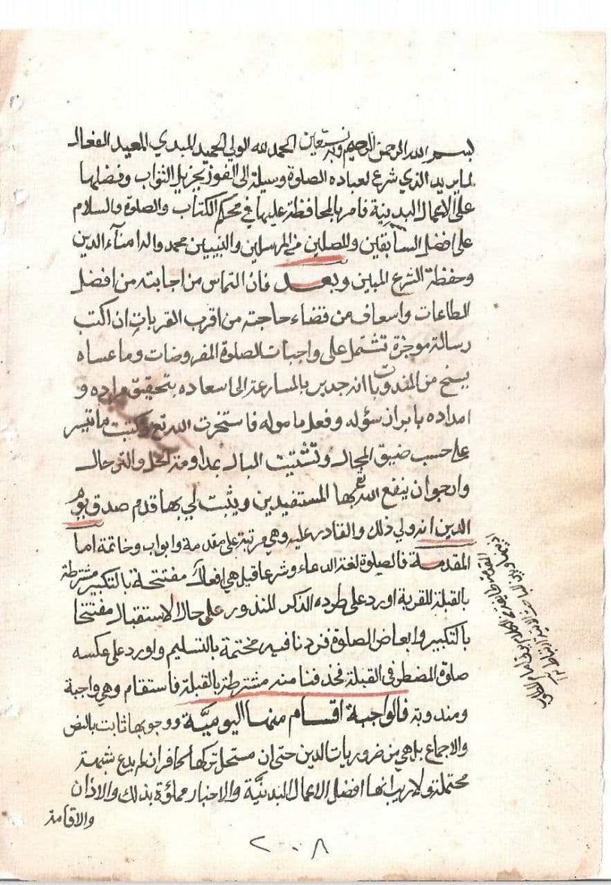 أوله: «بسم الله الرحمن الرحيم. الحمدُ لله الولي الحميد المبدي المعيد الفعال لما يريد الذي شرع لعبادة الصلاة وسيلة إلى الفوز بجزيل الثواب، وفضلها على الأعمال البدنية، فأمر بالمحافظة عليها في محكم الكتاب».