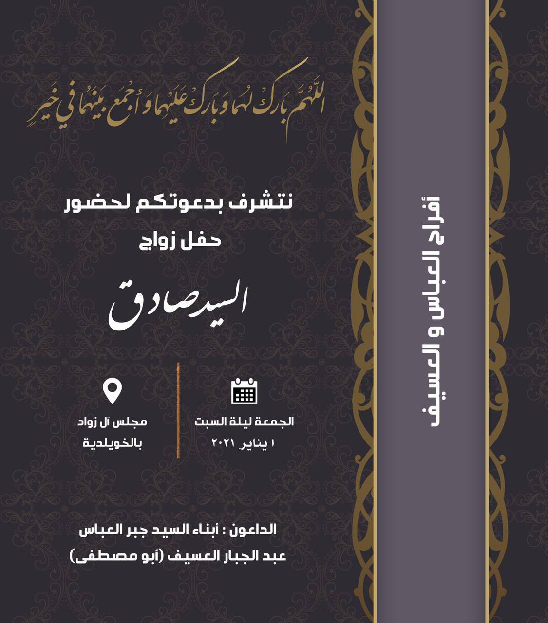 تحتفل عائلة العباس والعسيف في الخويلدية مساء يوم الجمعة بزفاف الشاب السيد صادق السيد جبر العباس على كريمة الحاج عبد الجبار العسيف في مجلس الزواد بالخويلدية مقابل النادي وسط فرحة الأهل والأصدقاء ومحبي العريسين.