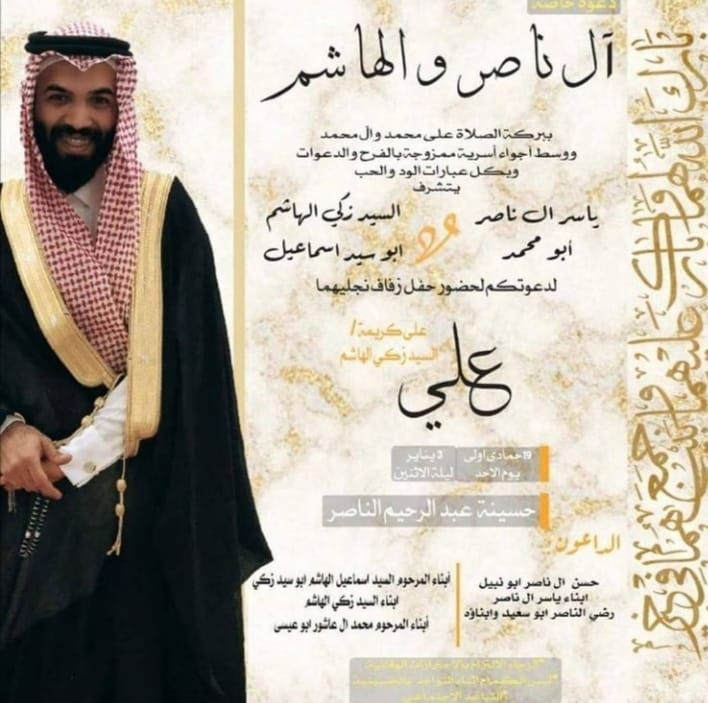 تحتفل عائلة آل ناصر والهاشم في الأوجام مساء يوم الأحد بزفاف الشاب علي ياسر آل ناصر على كريمة الحاج السيد زكي الهاشم «أبو سيد اسماعيل» في حسينية عبد الرحيم الناصر وسط فرحة الأهل والأصدقاء ومحبي العريسين.