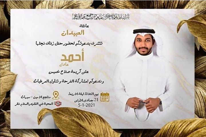 تحتفل عائلة العبيدان والخميس في سيهات مساء يوم الثلاثاء بزفاف الشاب أحمد عادل العبيدان على كريمة الحاج صلاح الخميس في منتجع الأمين بسيهات وسط فرحة الأهل والأصدقاء ومحبي العريسين.